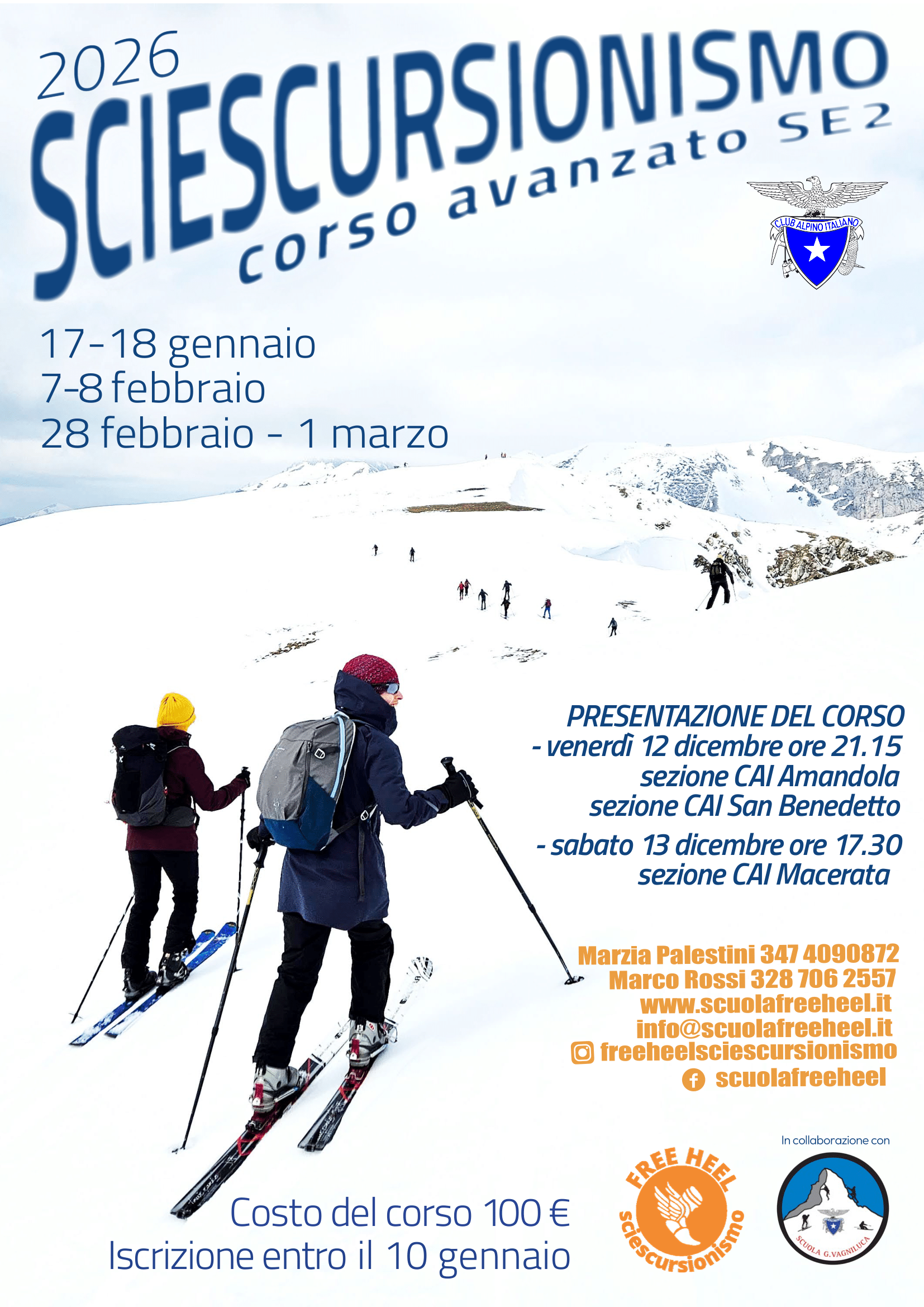 Comunichiamo che la Scuola intersezionale di Sciescursionismo “Free Heel” (di cui ne è parte anche la nostra Sezione) organizza nel 2026 il Corso di Sciescursionismo Avanzato (SE2). Il corso, strutturato in tre fine settimana a partire dal 17 gennaio fino al 1 marzo, è rivolto agli sciatori che vogliono migliorare le tecniche di progressione in salita e in discesa su percorsi non battuti (fuori pista) per esplorare la montagna invernale lontano dagli impianti.