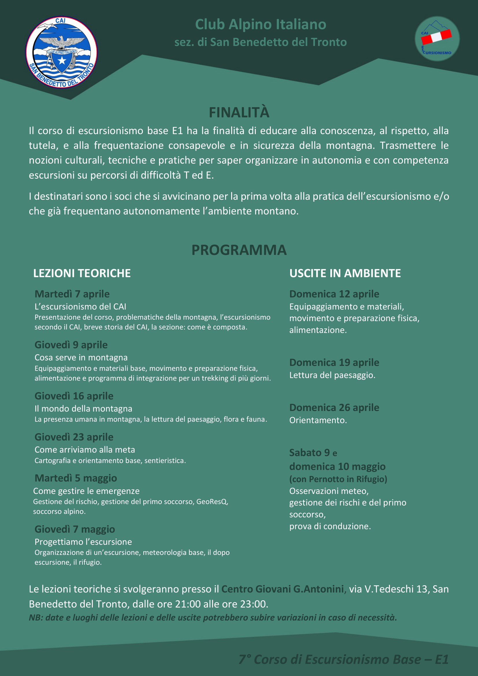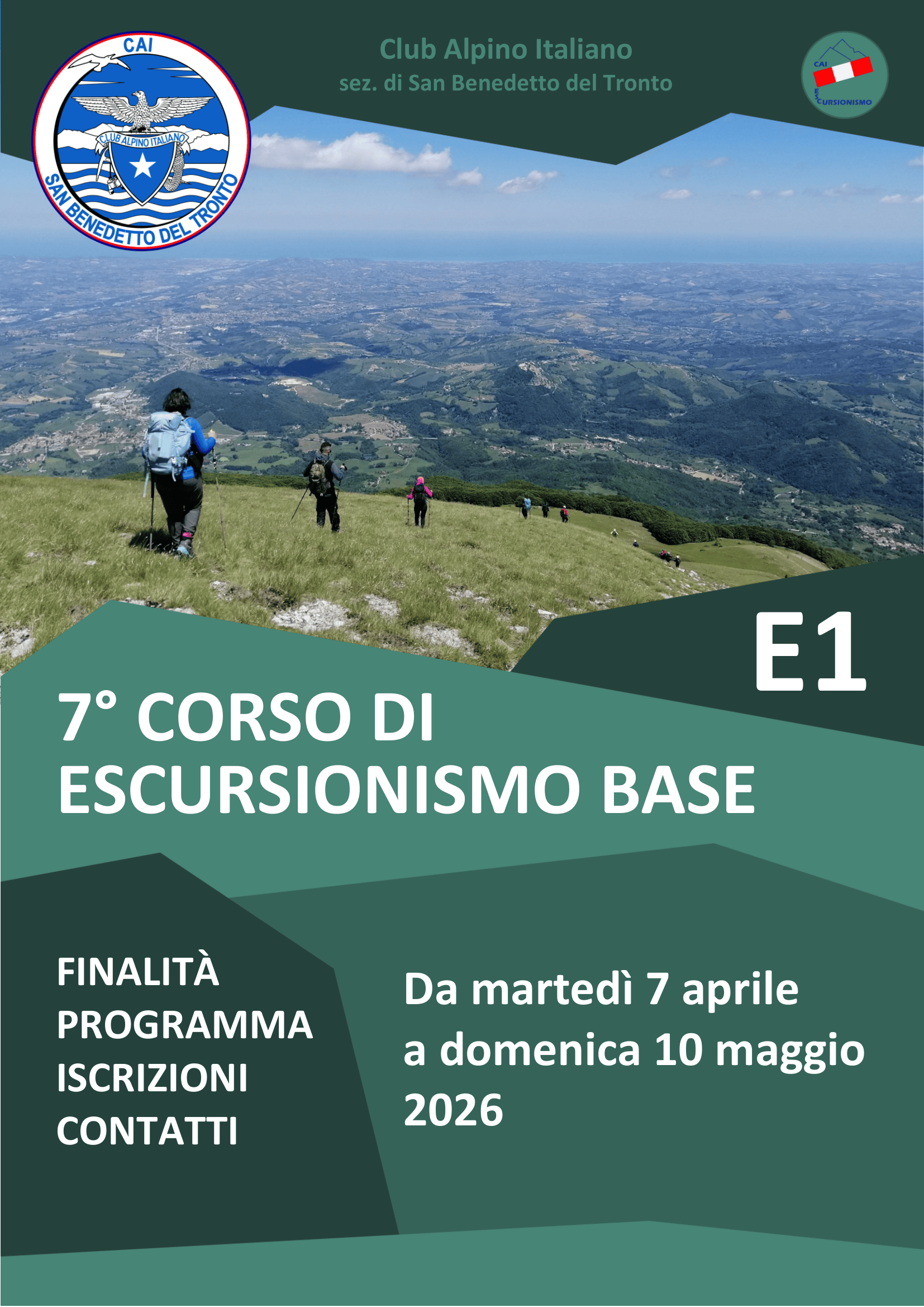Il Club Alpino Italiano (CAI) sezione di San Benedetto del Tronto, organizza dal 7 aprile al 10 maggio 2026 il 7° CORSO DI ESCURSIONISMO BASE (E1).