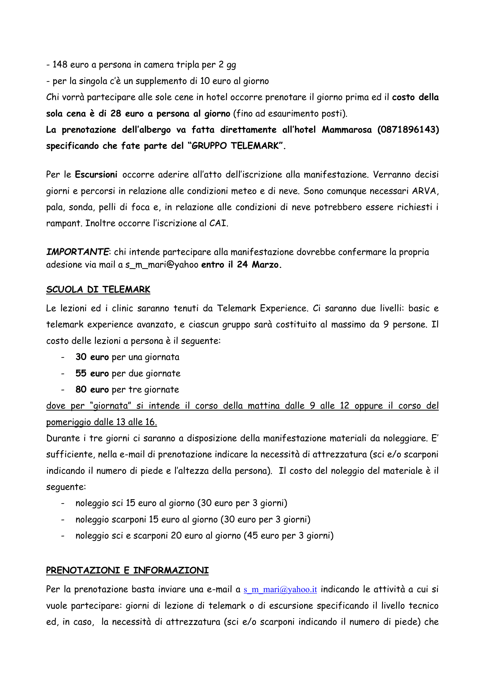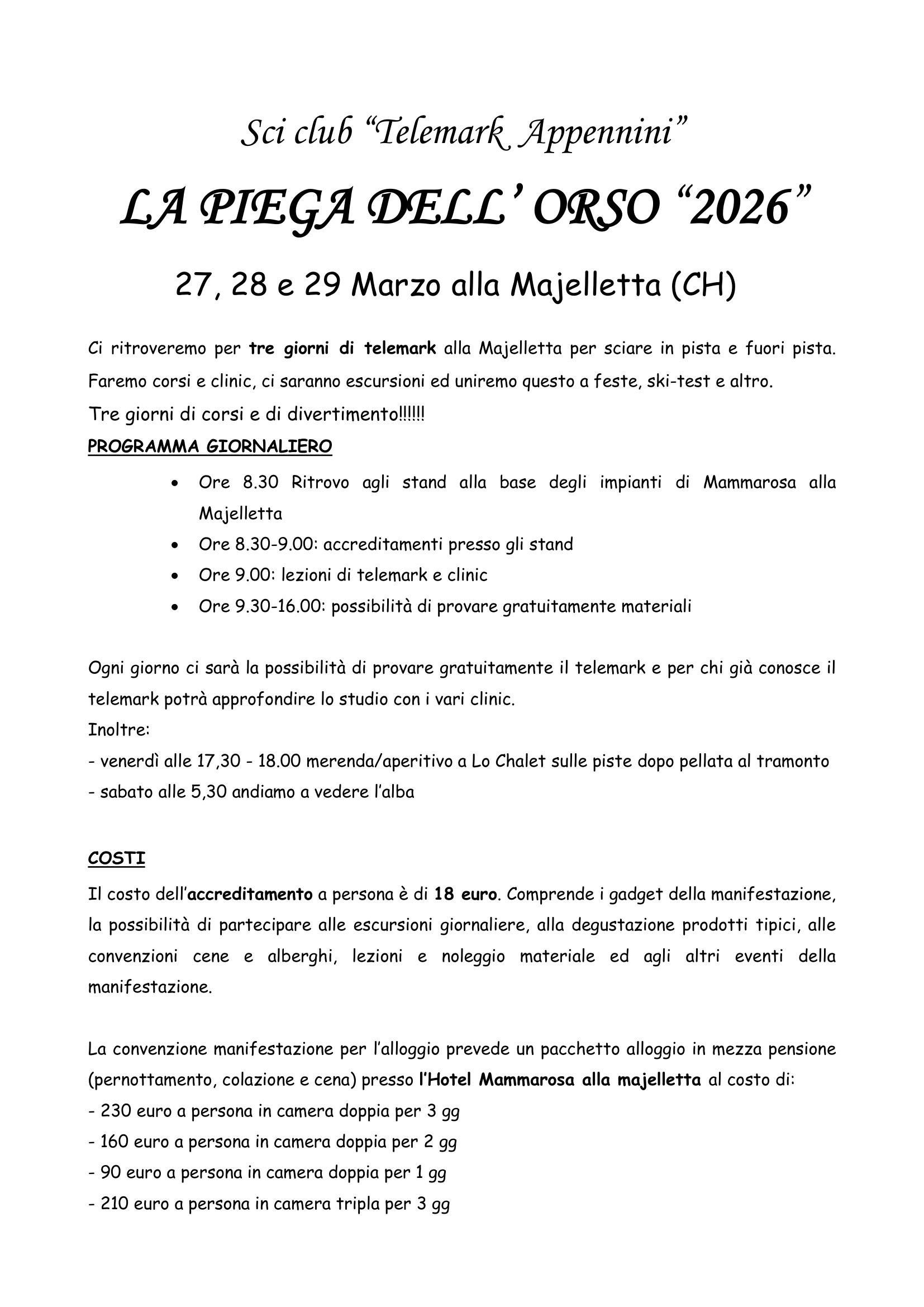 Per gli appassionati di Telemark, lo Sci Club “Telemark Appennini” ci invita all’evento annuale “La Piega dell’Orso” 2026 che si terrà il 27, 28 e 29 marzo sulla Maielletta (CH). Il programma prevede escursioni con sci, lezioni, noleggio materiali, e molte altre iniziative.