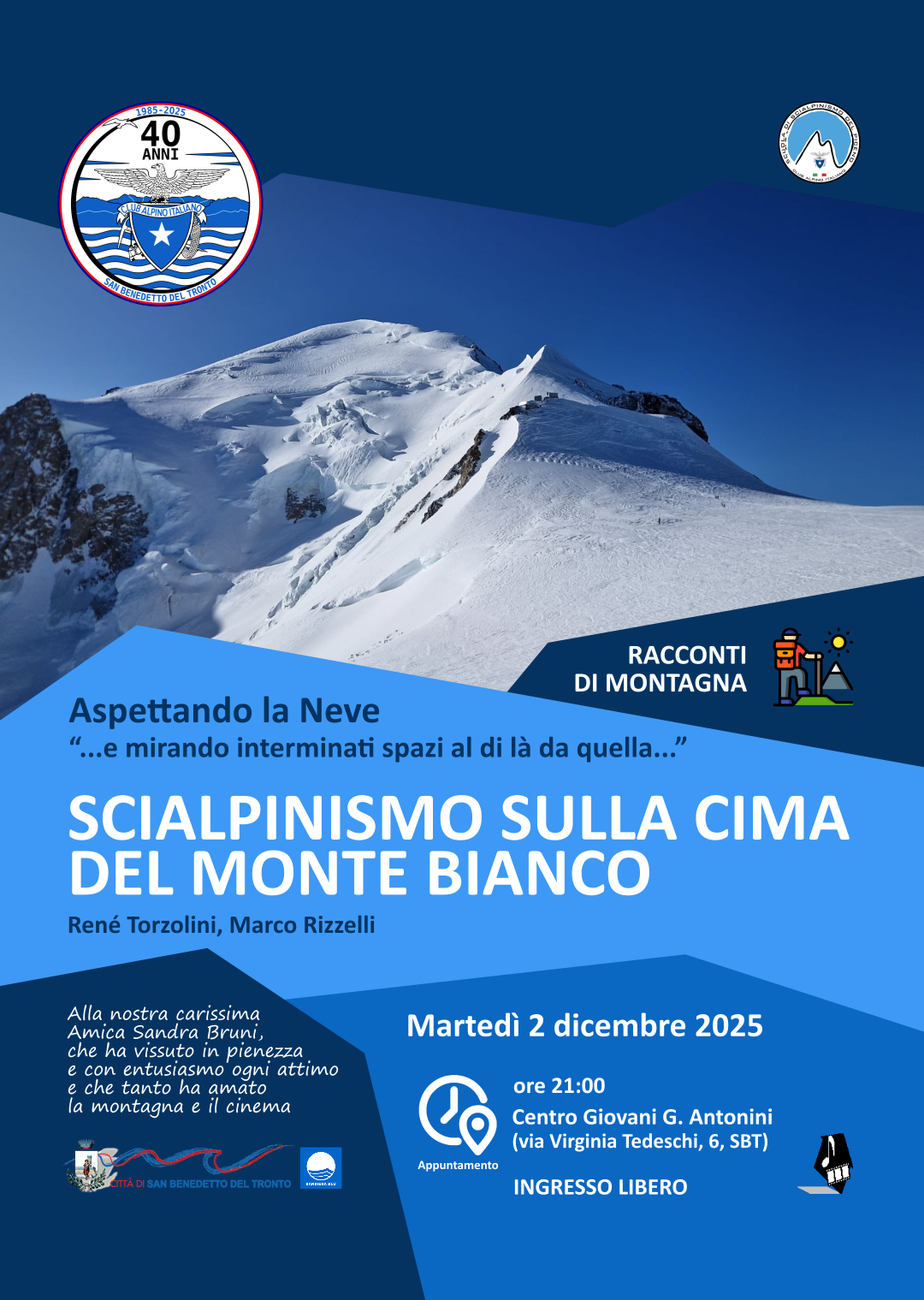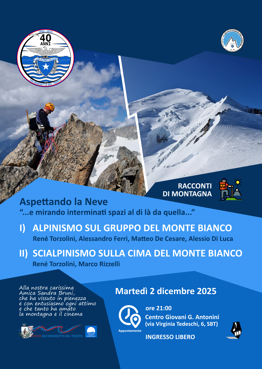 Comunichiamo che il secondo appuntamento del ciclo di incontri “Aspettando la neve” è in programma martedì 2 dicembre 2025, alle ore 21:00, presso il Centro Giovani “Giacomo Antonini” di San Benedetto del Tronto (via Virginia Tedeschi n.6). INGRESSO LIBERO.