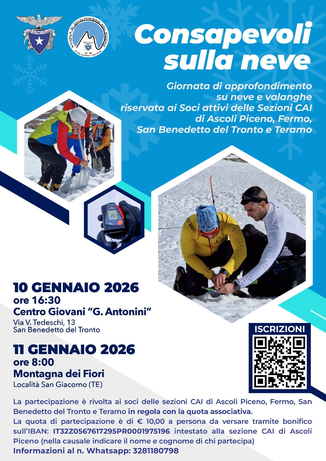 Comunichiamo che anche per questo 2026, la Scuola intersezionale di Scialpinismo del Piceno organizza un fine settimana (sabato 10 e domenica 11 gennaio 2026) di approfondimento su neve e valanghe rivolto a tutti i soci attivi (in regola col bollino 2025 e/o 2026).