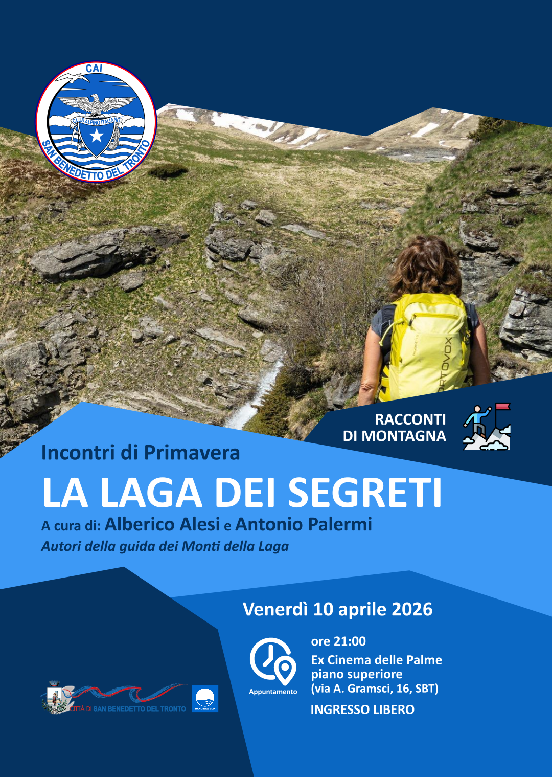 Per questa prima parte della stagione, il CAI Sezione di San Benedetto del Tronto organizza il ciclo di 3 (tre) incontri culturali “Incontri di primavera”. Gli incontri, rivolti a tutti (soci e non soci CAI), si svolgeranno nei venerdì di questa e delle prossime settimane di aprile presso la sede CAI di San benedetto del Tronto “ex Cinema delle Palme” (via Antonio Gramsci n.16, piano superiore). INGRESSO LIBERO.